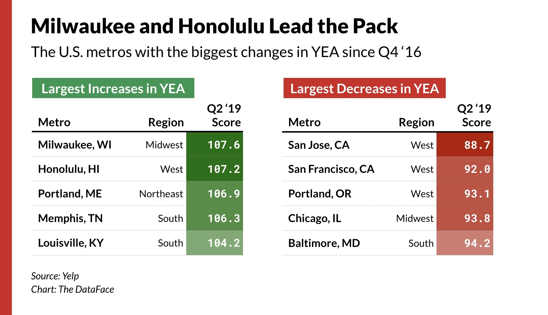 The YEA ticked down by 0.2% from the first quarter of 2019 to 99.2, reversing a brief and modest recovery. YEA grew with the economy in 2017, but is now down 2% from its peak and has been performing below its baseline level of 100 for the past three quarters. According to researchers, Yelp provides a timely and accurate measure of a huge swath of the economy that is often missed by many major indicators. The YEA measures strength using two signals: business survival and consumer interest. The opening of new businesses and an increase in consumer engagement both boost the YEA.